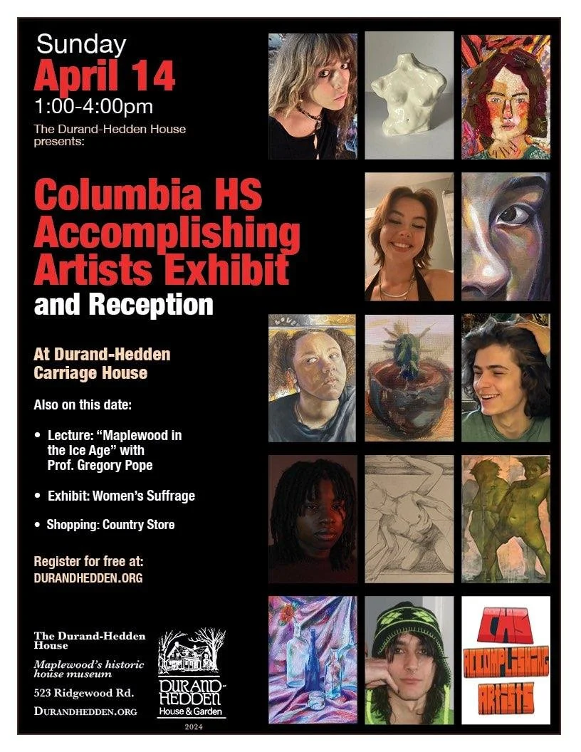 Durand-Hedden is pleased to host Columbia High School Accomplishing Artists on April 14 from 1 pm to 4 pm for an exhibit of their works. This will be held in conjunctions with Maplewood in the Ice Age, a lecture by Dr. Gregory Pope, which will be held at the main house. Registration for both events is free and available at DurandHedden.org.